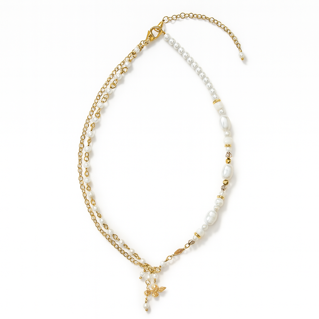 18K Gold Bee Charm Freshwater Pearl Necklace