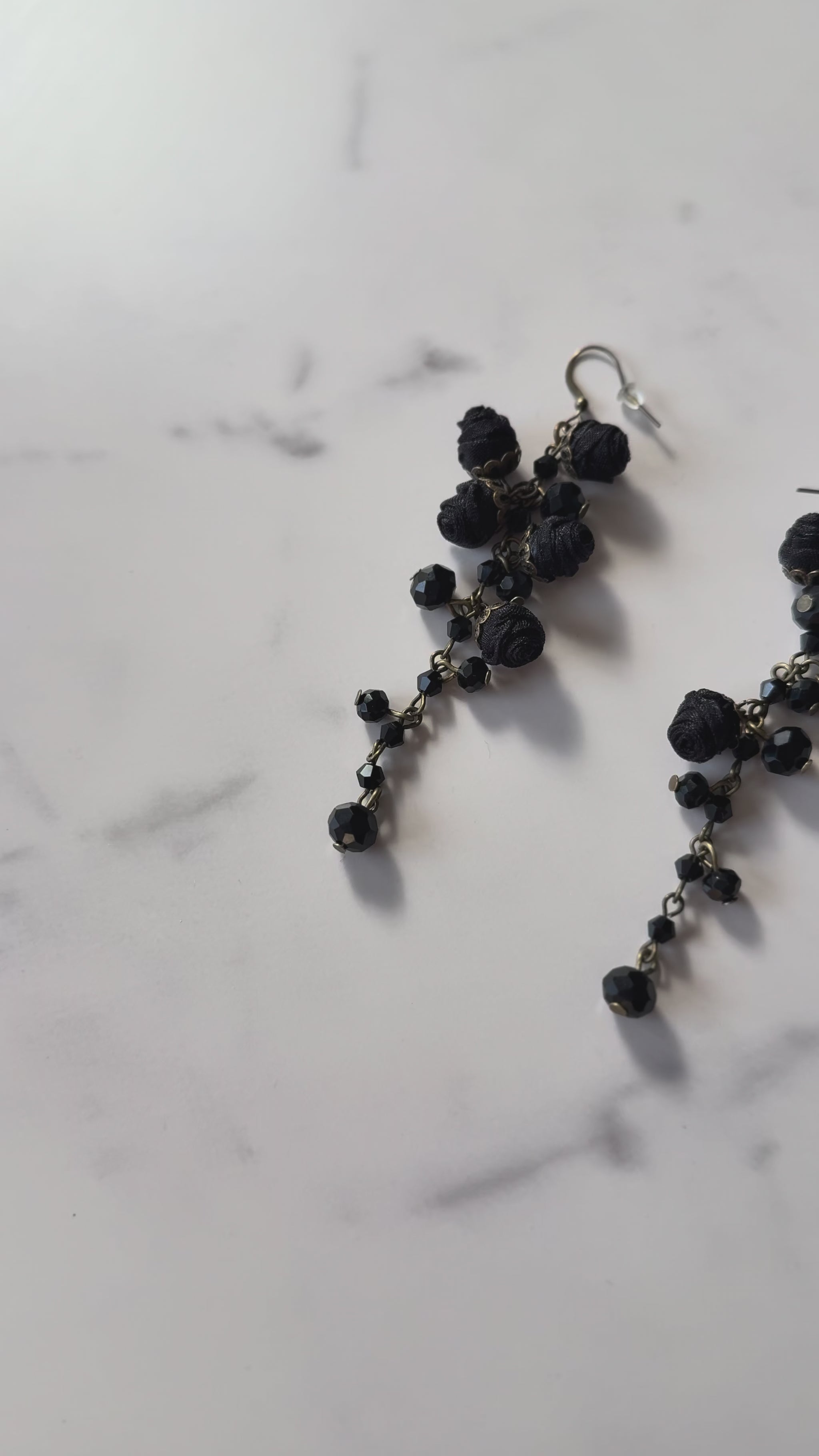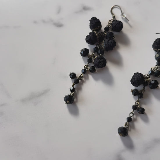 A sculptural floral statement earrings, the Eveline earrings from our Midnight Collection embodies soft strength — each cotton bloom hand-woven with shiny, genuine crystals and bronze chains for timeless, poetic elegance.