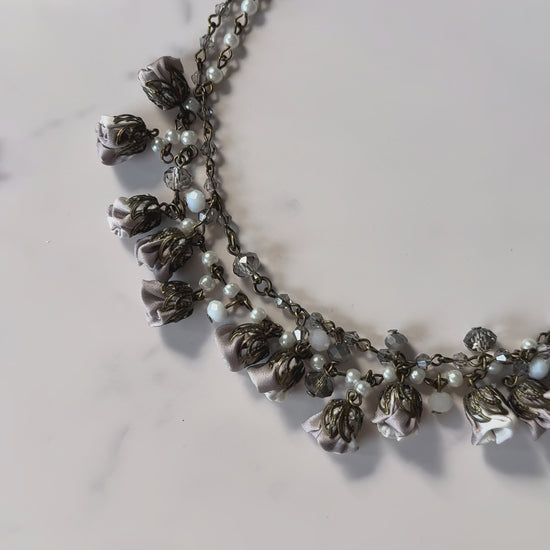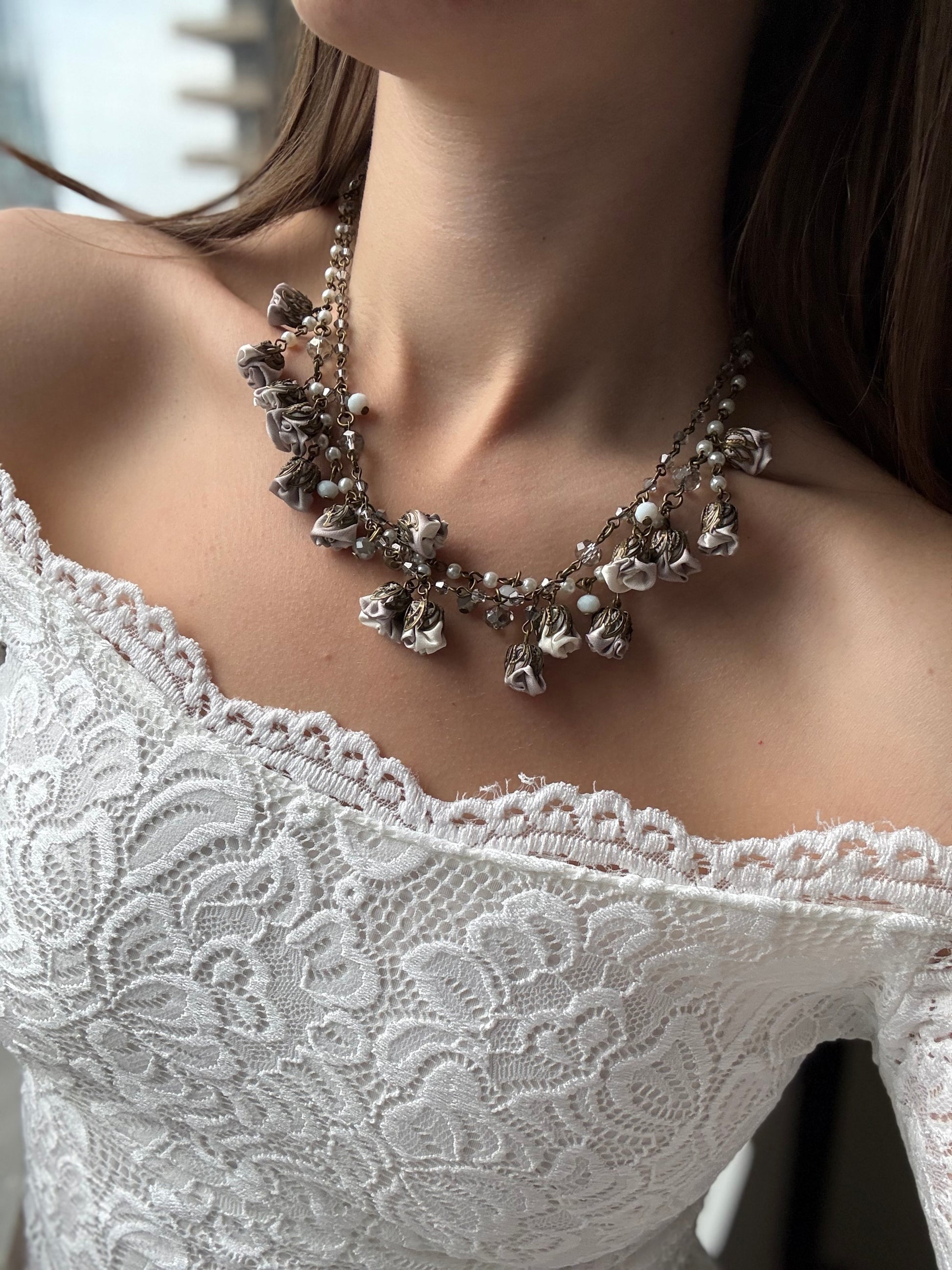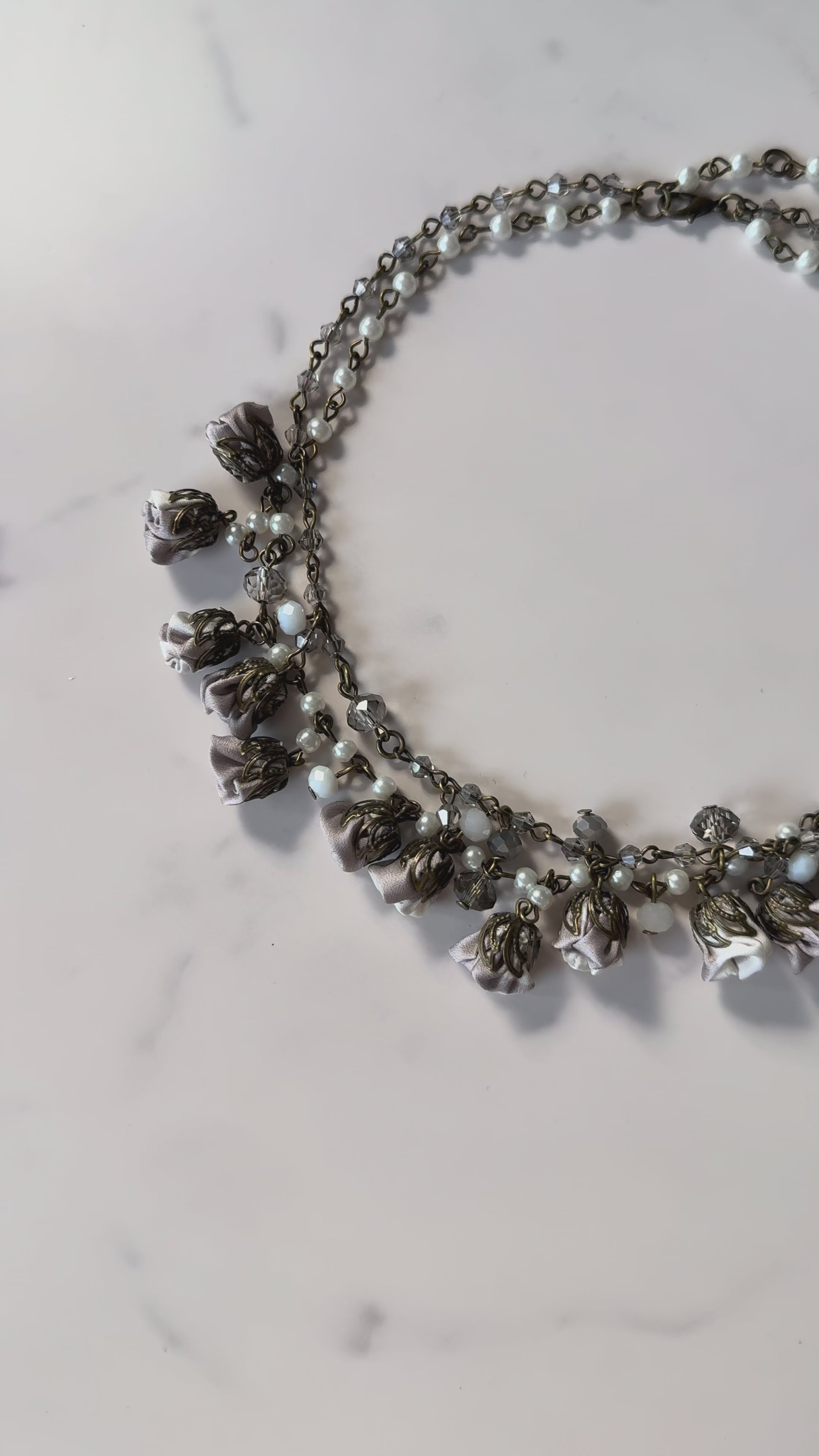 A sculptural floral statement necklace, the Linda Necklace from our Almond Collection embodies soft strength — each silk bloom hand-woven with shiny, genuine crystals and bronze chains for timeless, poetic elegance.