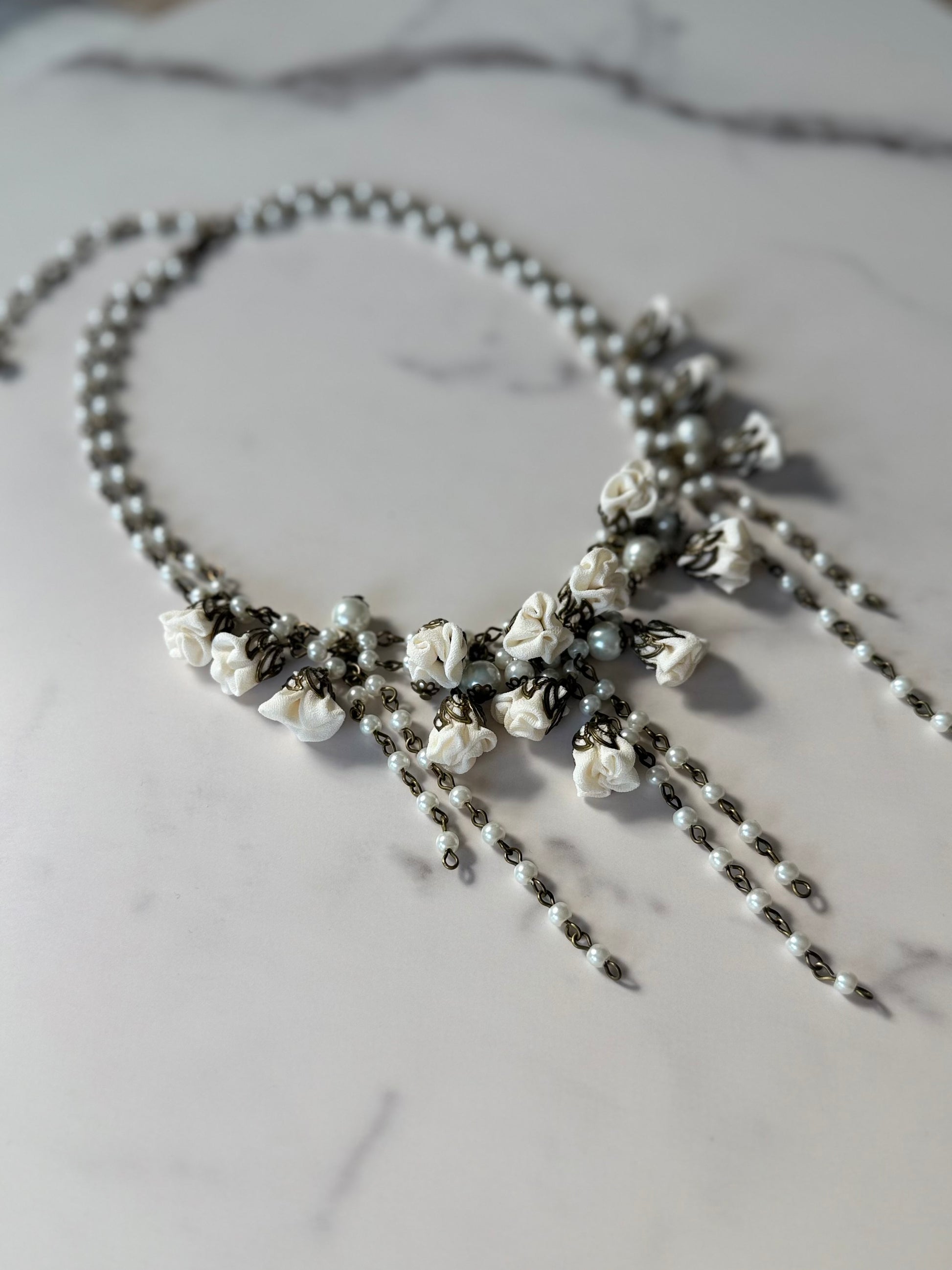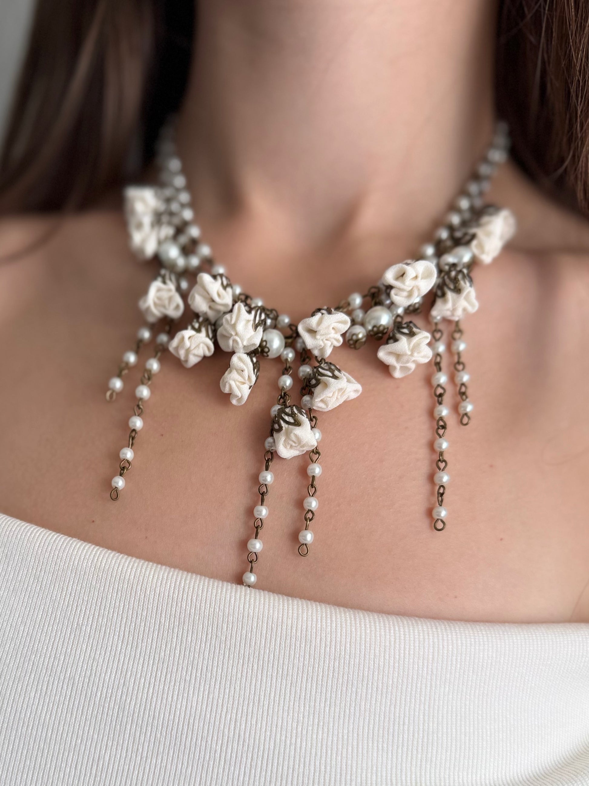A sculptural floral statement necklace, the Anna Necklace from our Creme Collection embodies soft strength — each cotton and silk bloom hand-woven with freshwater pearls and bronze chains for timeless, poetic elegance.