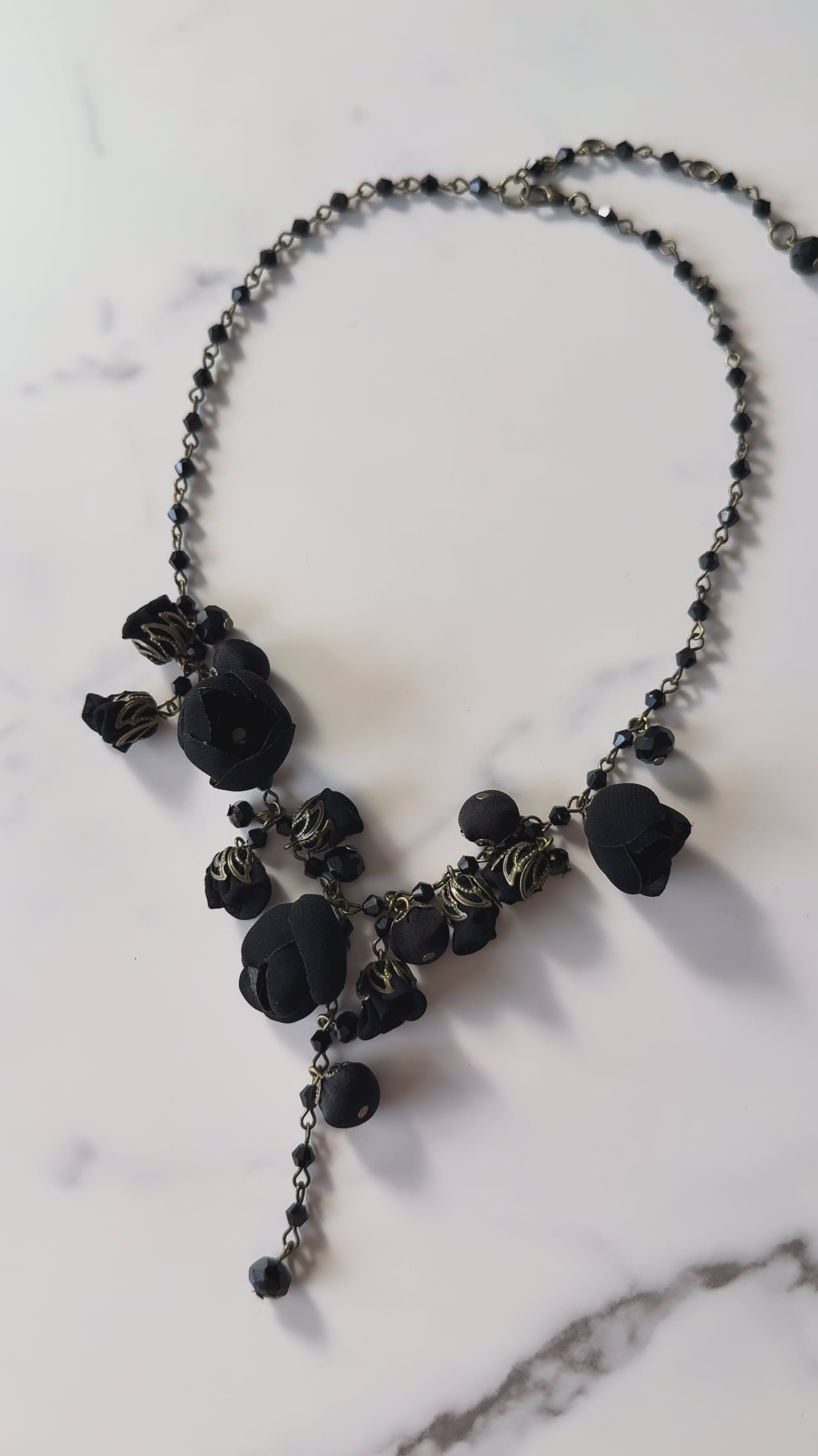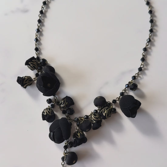 A sculptural floral statement necklace, the Serene Necklace from our Midnight Collection embodies soft strength — each cotton and silk bloom hand-woven with shiny, genuine crystals and bronze chains for timeless, poetic elegance.